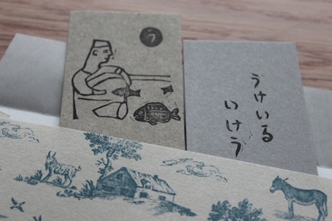 To make the Karuta, Akiko thought about printing those at first, but since she wanted to keep the price low enough to enable children to play casually, while insisting on the texture and thickness of the paper, she made eraser stamps and print it manually one by one.